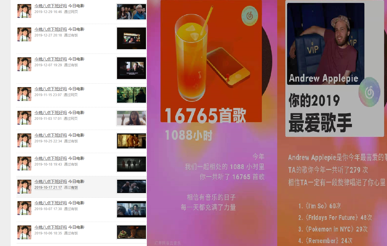 今年观影70+,还为观影事业买了个投影仪,每个周末的夜晚,100寸电子辐射的快乐,碳水化合物乐园,灵魂像膨化食品被打开时一样开心的裂开。听歌方面依然是摇滚为主,流行和民谣听一些,没想到居然Andrew Applepie成为了年度歌手,一度认为人类必须牵着手才能听Applepie,哎呀哎呀摇滚死了呀。