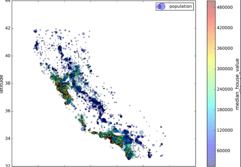 每个圈的半径表示街区的人口(选项s),颜色代表价格(选项c)。我们用预先定义的名为jet的颜色图(选项cmap),它的范围是从蓝色(低价)到红色(高价):