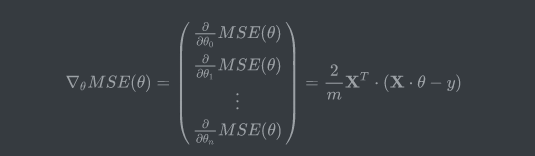 为了避免单独计算每一个梯度,你也可以使用下面的公式来一起计算它们。梯度向量记为$\nabla_{\theta}MSE(\theta) $ ,其包含了代价函数所有的偏导数(每个模型参数只出现一次)。利用正态方程最后的推导即可)