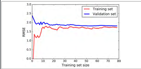 上面的曲线表现了一个典型的欠拟合模型,两条曲线都到达高原地带并趋于稳定,并且最后两条曲线非常接近,同时误差值非常大。