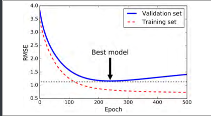 随着训练的进行,算法一直学习,它在训练集上的预测误差(RMSE)自然而然的下降。然而一段时间后,验证误差停止下降,并开始上升。这意味着模型在训练集上开始出现过拟合。一旦验证错误达到最小值,便提早停止训练.