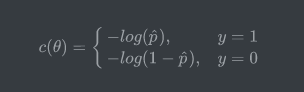 这个代价函数是合理的,因为当t接近0时,-log(t)变得非常大,所以如果模型估计一个正例概率接近于0,那么代价函数将会很大,同时如果模型估计一个负例的概率接近1,那么代价函数同样会很大。 另一方面,当t接近于1时, -log(t)接近0,所以如果模型估计一个正例概率接近于0,那么代价函数接近于0,同时如果模型估计一个负例的概率接近0,那么代价函数同样会接近于0, 这正是我们想的.(简单来说,y=1时,概率p越接近1损失越小;相反y=0时,概率p越接近0时损失越小)