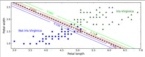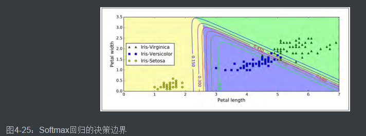图4-25用不同背景色表示了结果的决策边界。注意,任何两个类之间的决策边界是线性的。 该图的曲线表示Versicolor类的概率(例如,用0.450标记的曲线表示45%的概率边界)。注意模型也可以预测一个概率低于50%的类。 例如,在所有决策边界相遇的地方,所有类的估计概率相等,分别为33%。