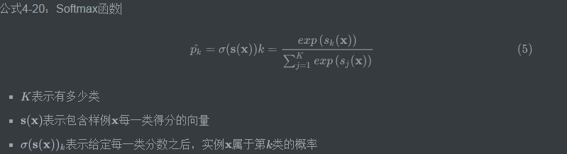 这个想法很简单:当给定一个实例x 时,Softmax回归模型首先计算k类的分数sk(x) ,然后将分数应用在Softmax函数(也称为归一化指数)上,估计出每类的概率。 计算sk(x) 的公式看起来很熟悉,因为它就像线性回归预测的公式一样