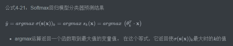 和Logistic回归分类器一样,Softmax回归分类器将估计概率最高(它只是得分最高的类)的那类作为预测结果,如公式4-21所示