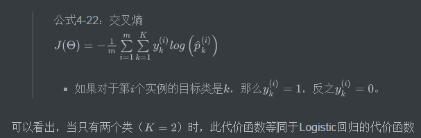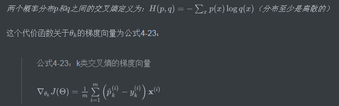 上面这个公式由公式4-22求导得到,过程和逻辑回归损失函数一样,只不过将每个类别都纳入计算而已,当k=2则计算正负两类,与逻辑回归一模一样。现在你可以计算每一类的梯度向量,然后使用梯度下降(或者其他的优化算法)找到使得代价函数达到最小值的参数矩阵Θ。