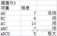 一个举例:(AB项集为非闭是因为和ABC项集具有相同的支持度计数,ABC为非极大是存在频繁项集ABCD)
