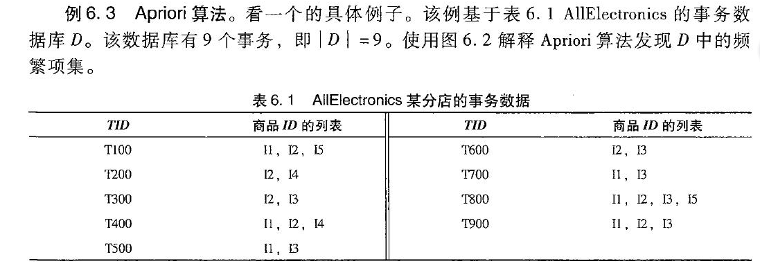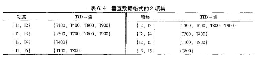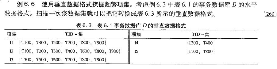 Apriori算法和FP-growth算法都是从TID-项集格式(即\{TID : itemset \})的事务集中挖掘频繁模式,其中TID是事务标识符, 而itemset是事务TID中购买的商品。这种数据格式称为水平数据格式。或者,数据也可以用项-TID集格式(即\{item : TID_set\})表示,这种格式称为垂直数据格式。