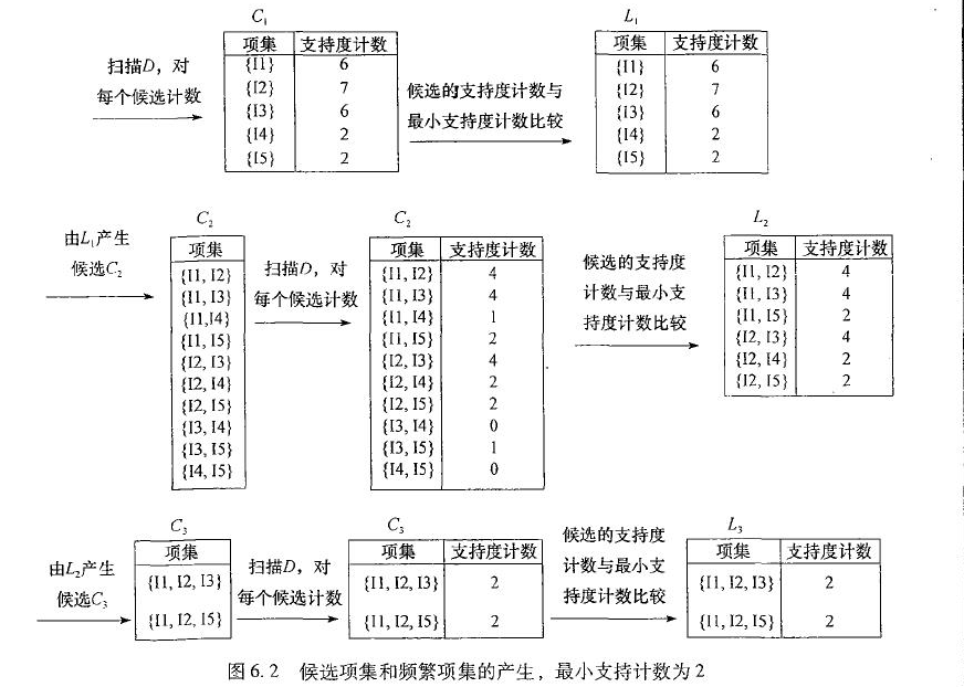 aproori算法过程:假设最小支持度计数为2,即min_sup=2
