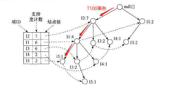 然后,FP-树构造如下:首先,创建树的根结点,用“null”标记。二次扫描数据库 D。每个事务中的项按 L 中的次序处理(即,根据递减支持度计数排序)并对每个事务创建一个分枝。例如,第一个事务“T100: I1, I2, I5”按 L 的次序包含三个项\{ I2, I1, I5\},导致构造树的第一个分枝[(I2:1), (I1:1), (I5:1)]。该分枝具有三个结点,其中,I2 作为根的子女链接,I1 链接到 I2,I5 链接到 I1。第二个事务 T200 按 L 的次序包含项 I2 和 I4,它导致一个分枝,其中,I2 链接到根,I4 链接到 I2。然而,该分枝应当与 T100 已存在的路径共享前缀 I2。这样,我们将结点 I2 的计数增加 1,并创建一个新结点(I4:1),它作为(I2:2)的子女链接。一般地,当为一个事务考虑增加分枝时,沿共同前缀上的每个结点的计数增加 1,为随在前缀之后的项创建结点并链接。
