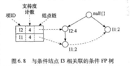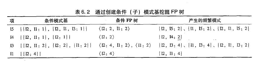 FP-树的挖掘总结在表 6.1 中,细节如下。让我们首先考虑 I5,它是 L 中的最后一个项,而不是第一个。其原因随着我们解释 FP-树挖掘过程就会清楚。I5 出现在上图 的 FP-树的两个分枝。(I5 的出现容易通过沿它的结点链到。)它的两个对应前缀路径是[(I2, I1:1)>和<(I2, I1, I3:1)],它们形成I5 的条件模式基。然后以及条件模式基和最小支持度计数构建条件FP树,它的条件 FP-树只包含单个路径[(I2:2, I1:2)] (括号里面为路径形式,给出构建的FP树种每个节点的支持度计数);不包含 I3,因为它的支持度计数为 1,小于最小支持度计数。最后,I5与该路径产生频繁模式的所有组合(I5与路径的所有组合一定是要包含I5的)。组合的支持度计数是根据与结合的节点的支持数决定的。